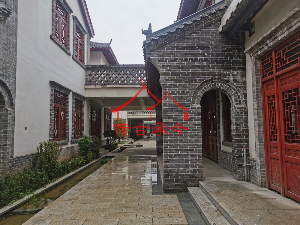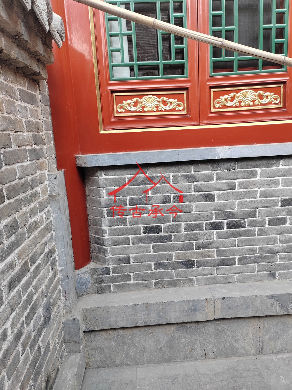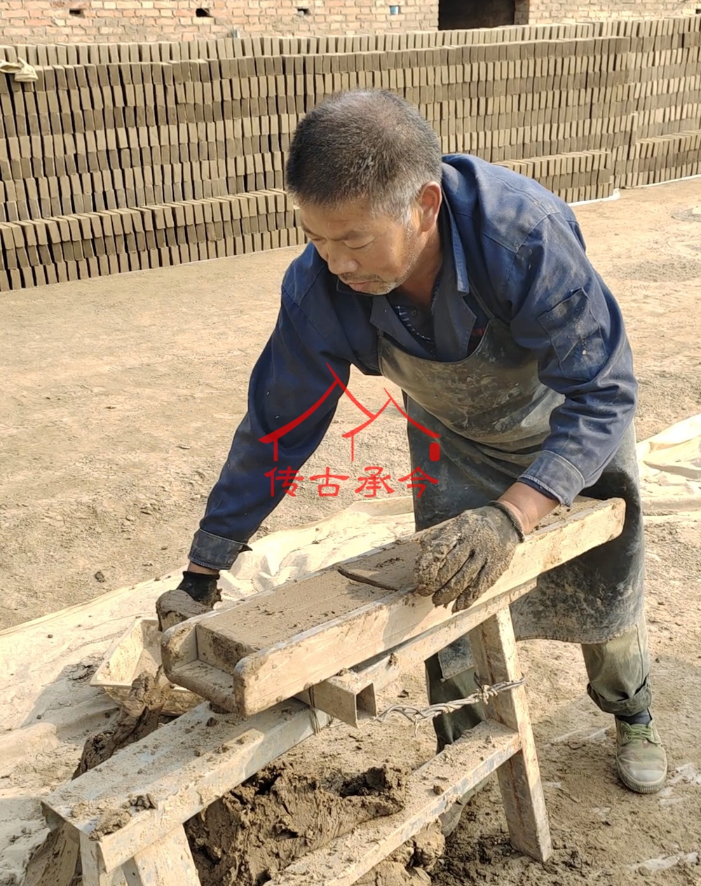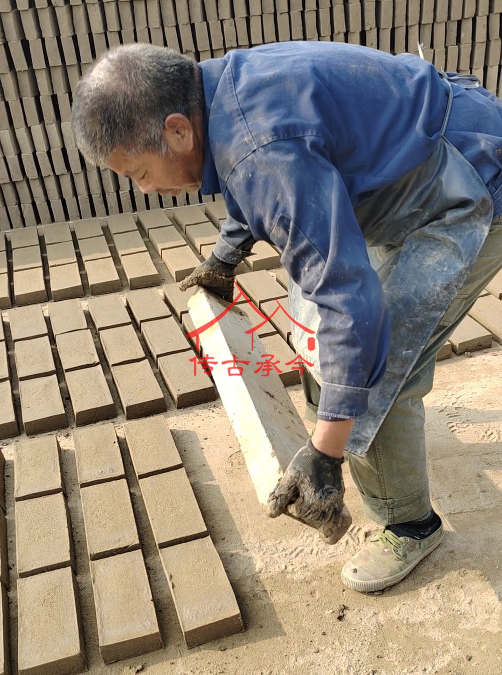 古法手工制作青磚,所有工藝流程全部人工操作。上選優(yōu)質(zhì)粘土,涼曬、翻攪,去暴質(zhì)、增柔性,再經(jīng)篩選;用中性水和泥、練泥、打漿,置稠泥于框中,著鐵線弓戛平其面而成坯型,存陰棚內(nèi),日日轉(zhuǎn)筑,陰7日后,用木板將坯面壓平、壓實,移至亭子間花架碼放,自然陰干;然后裝窯、烘干,在窯內(nèi)經(jīng)一個月左右不同火力焙燒,再窨水,前后十幾道工序而后出窯。
