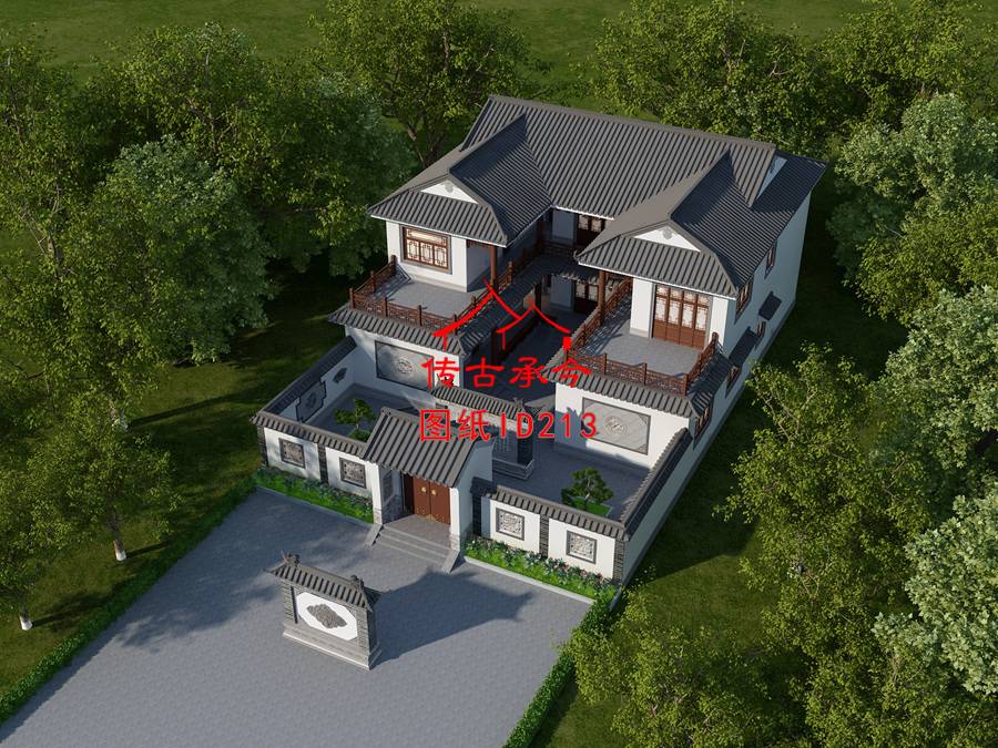 編號(hào)213:16.2*25.3米二層連體歇山新中式三合院全套施工圖紙?jiān)O(shè)計(jì)圖紙