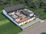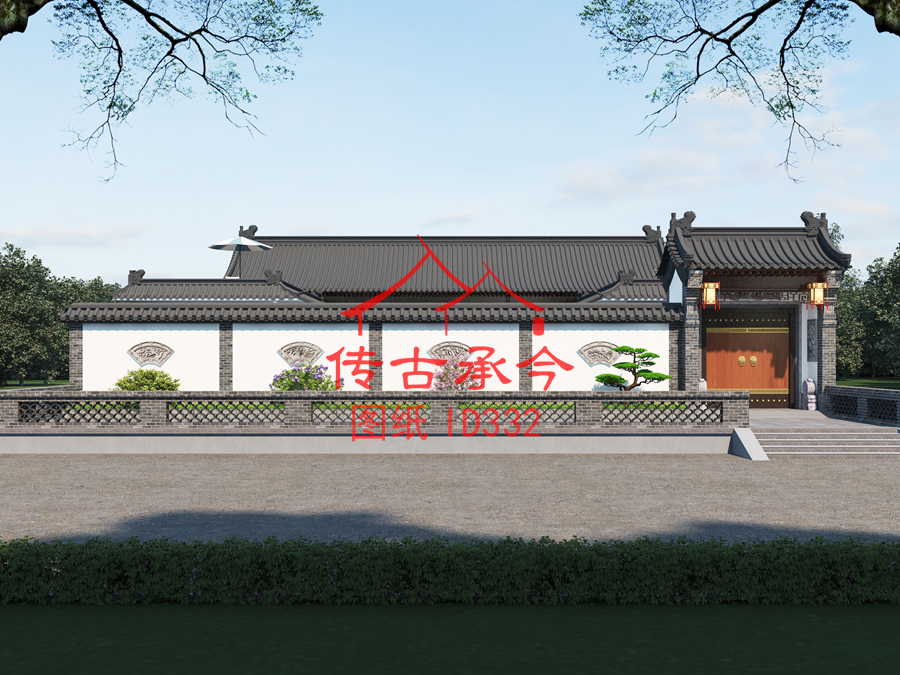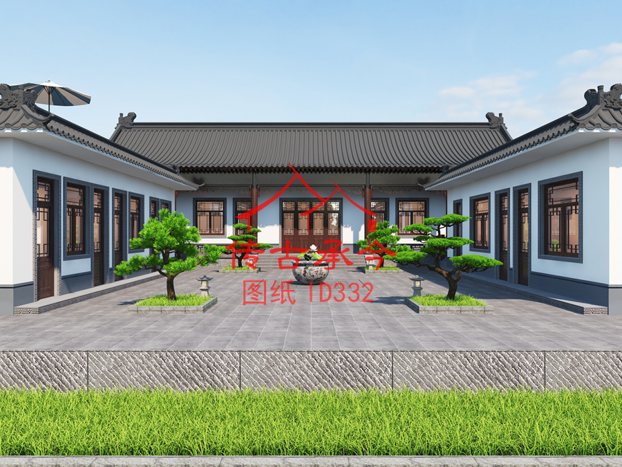 編號332:21*27.6米人字坡平頂出檐混合風格中式三合院全套施工圖紙設(shè)計圖紙