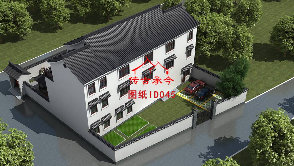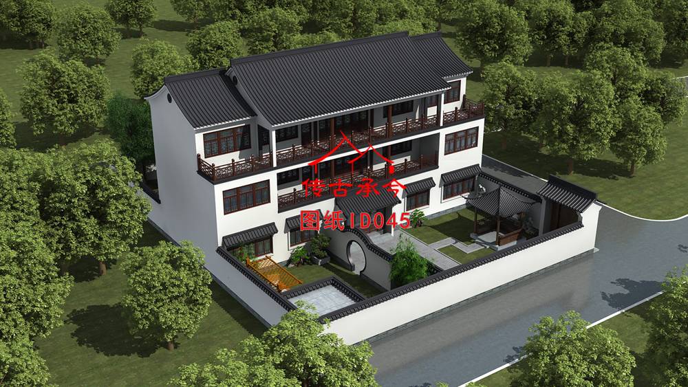 一層中式院子戶型圖 二層三層別墅戶型圖 白墻新中式合院鳥瞰圖 白墻簡約外立面效果圖 白墻灰瓦新中式鳥瞰圖