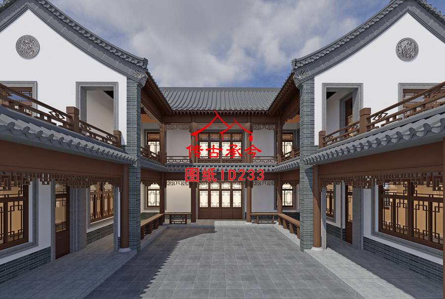 編號(hào)233:21.2*18.2米二層帶露臺(tái)U型布局四合院全套施工圖紙?jiān)O(shè)計(jì)圖紙